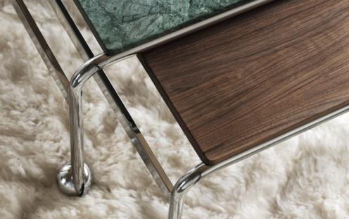 Bazuar në tavolinën origjinale të Bruno Mathsson, e dizajnuar për të shoqëruar karrigen e tij klasike, ky opsion disi më i madh ofron hapësirë më të madhe të sipërfaqes me të njëjtën estetikë elegante të koleksionit Karin. Korniza e kromuar është e veshur në krye me mermer ekskluziv, gur gëlqeror ose dru arre.