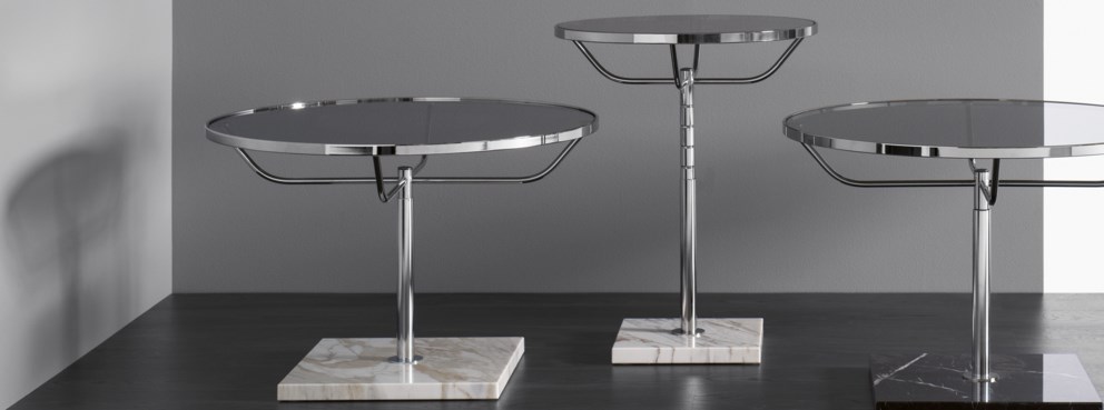 Një tavolinë klasike e rrumbullakët në krom, me përshtatje manuale të lartësisë dhe bazë mermeri.